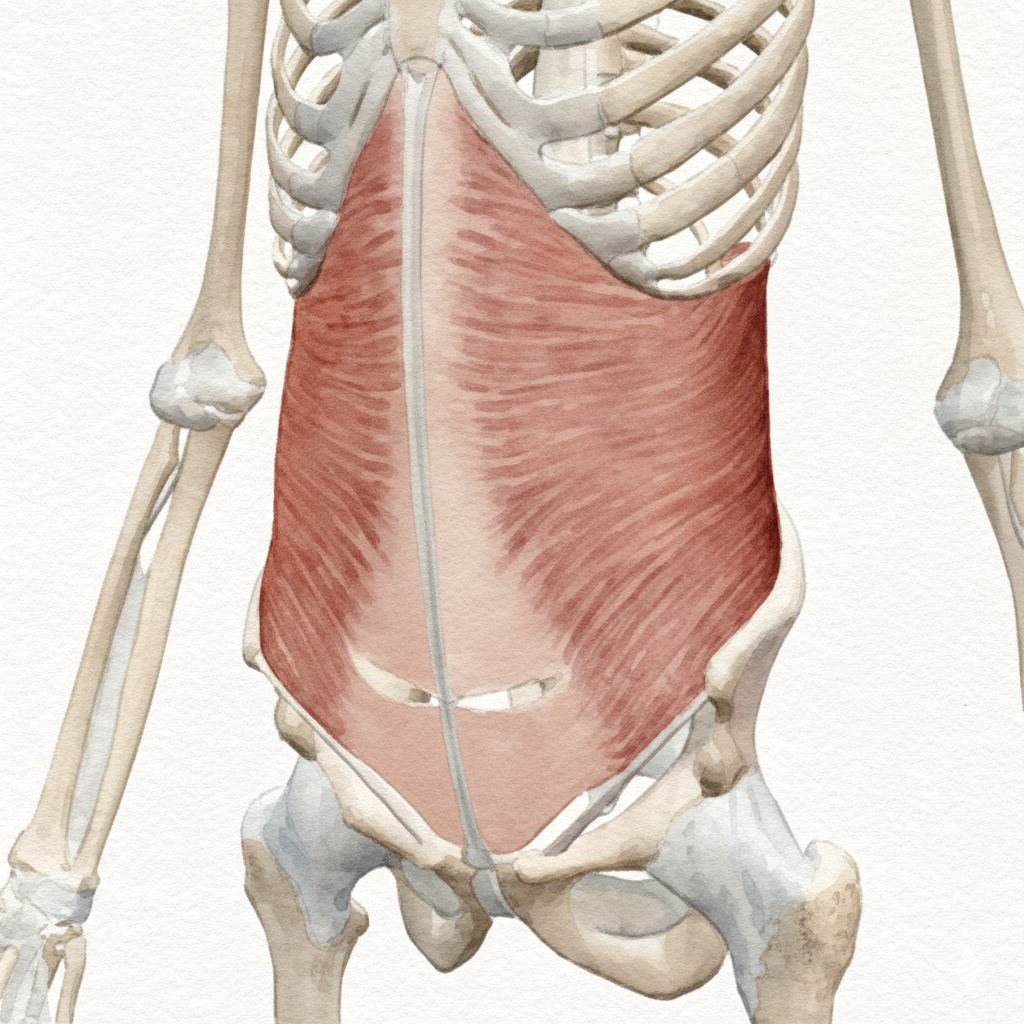 お腹の最も深い層にある筋肉で、天然のコルセットのように体幹(胴体部分)を安定させる役割を持っています。この筋肉が適切に働くことで、腰への負担を驚くほど減らすことができます。