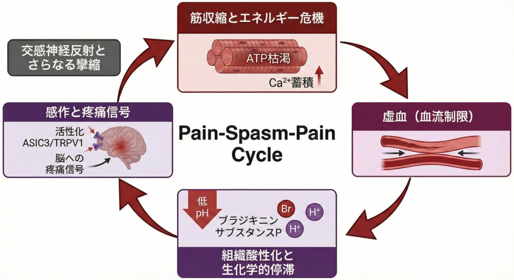 以下の図は、上述した「エネルギー危機」から「組織の酸性化」、そして「痛みの悪循環」に至る一連の生理学的プロセスをまとめたものである。