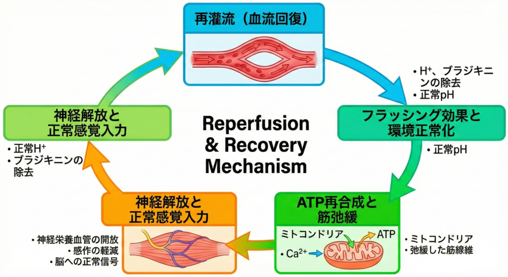 以下の図は、前編の「悪循環」とは対照的な、血流回復(再灌流)がもたらす生理学的な「回復の好循環」をまとめたものである。