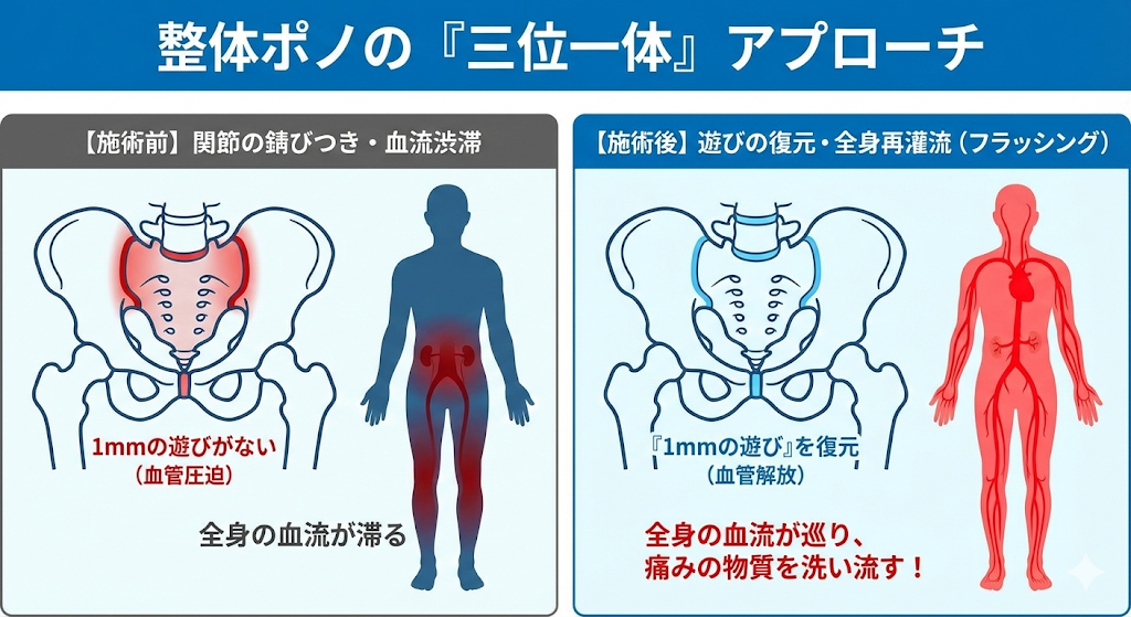 整体ポノでは、画像に写らない関節の微小な動き(関節機能障害)を復元します。土台となる骨盤(仙腸関節)や背骨に「1mmの余裕」が戻れば、寝返りを打つ際の踏ん張りが効くようになり、睡眠中の血流が劇的に改善します。