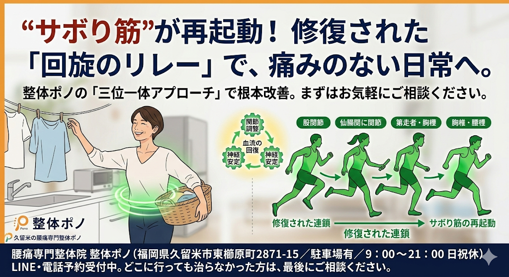 サボっている股関節と胸椎の回旋力を取り戻し(関節の調整)、酸欠になった組織に血流を届け(血流の回復)、脳の「ねじるのが怖い」という誤ったアラームを解除する(神経の安定)。この三位一体のアプローチで「回旋のリレー」を再構築したとき、あなたの体には「ああ、ねじっても大丈夫なんだ」という安心が静かに戻ってきます。