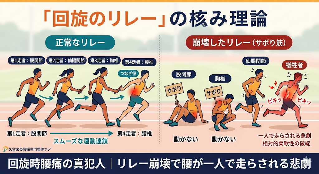 回旋時腰痛の真犯人|リレー崩壊で腰が「一人で走らされる」悲劇