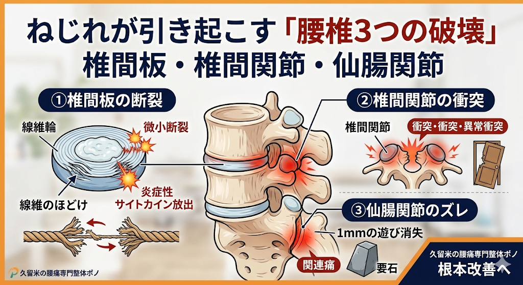 【結論】 過剰なねじれ力(捻転力)は、腰椎の中で「椎間板の断裂」「椎間関節の衝突」「仙腸関節のズレ」という3つの構造的破壊と、それに伴う深刻な炎症カスケードを引き起こします。