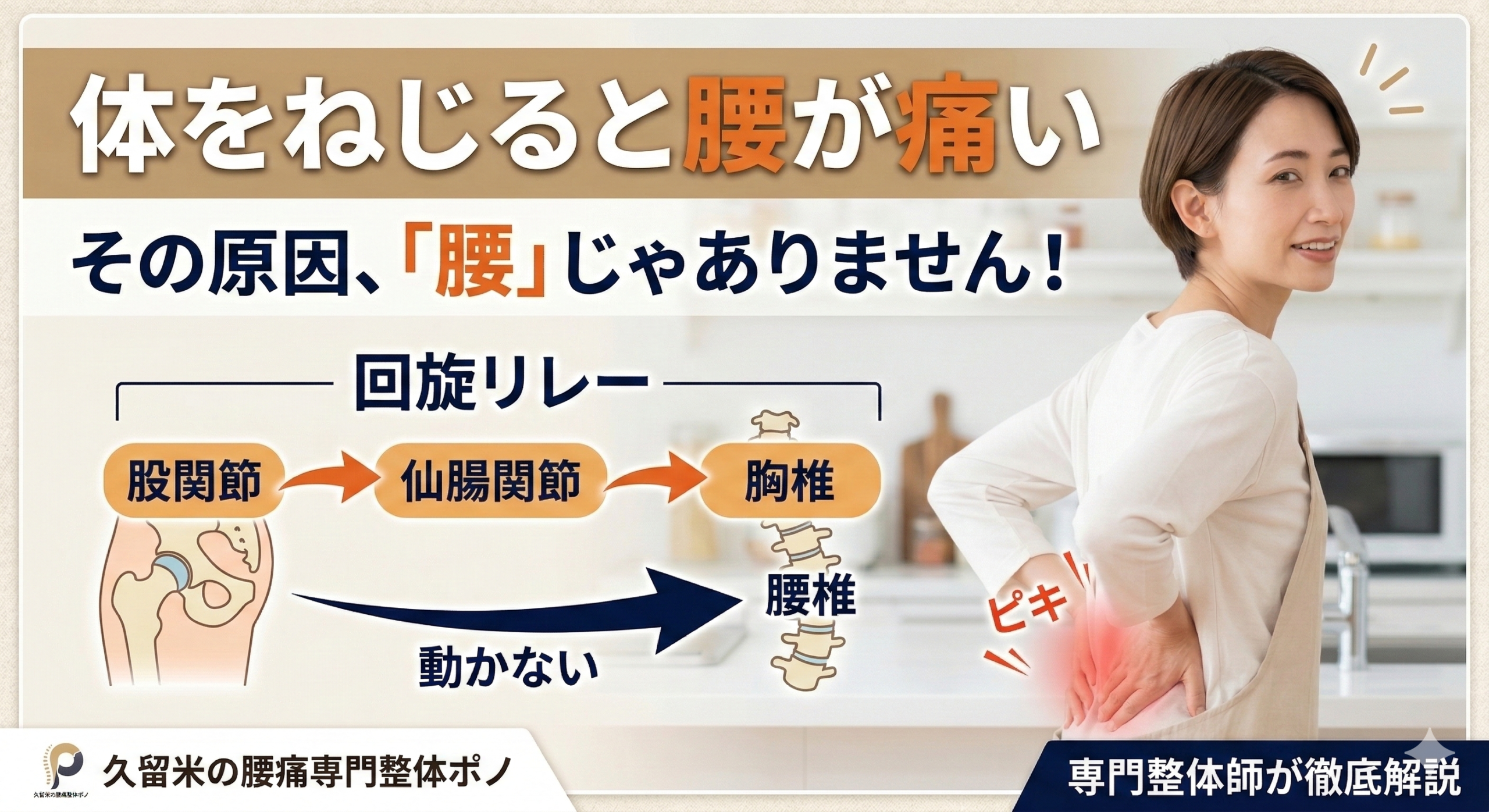 【この記事の結論】 体をねじったときの腰痛は、本来ねじりを担うべき股関節や胸椎の動きが低下し、構造的にねじれない腰椎が犠牲になっている結果です。根本改善には「関節の調整・血流の回復・神経の安定」の三位一体アプローチが不可欠です。